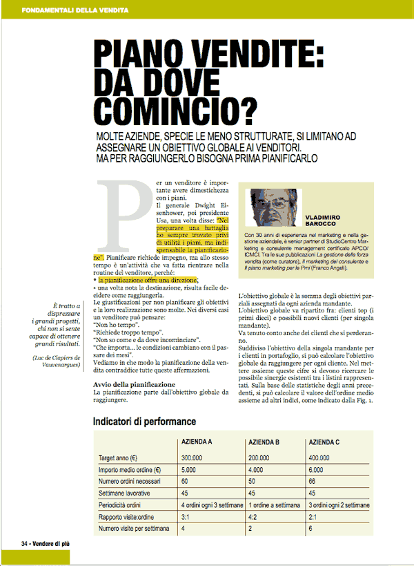Molte aziende, specie le meno strutturate, si limitano ad assegnare un obiettivo globale ai venditori. Ma per raggiungerlo bisogna prima pianificarlo. pubblicato in Vendere di più Per un venditore è importante avere dimestichezza con [...]